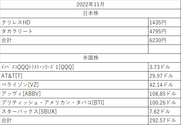 気が付いたら2022年も終わりが近づいてきた。そしてブログの更新も滞っていることにようやく気が付いた。。。仕事の方は相変わらず激務が続いていたが年末になって少しだけゆっくりできたのが幸いであった。何事においてもゆとりが大切なのだなと思う。では、遅くなってしまったが11月の配当金&株主優待集計を見ていこう。